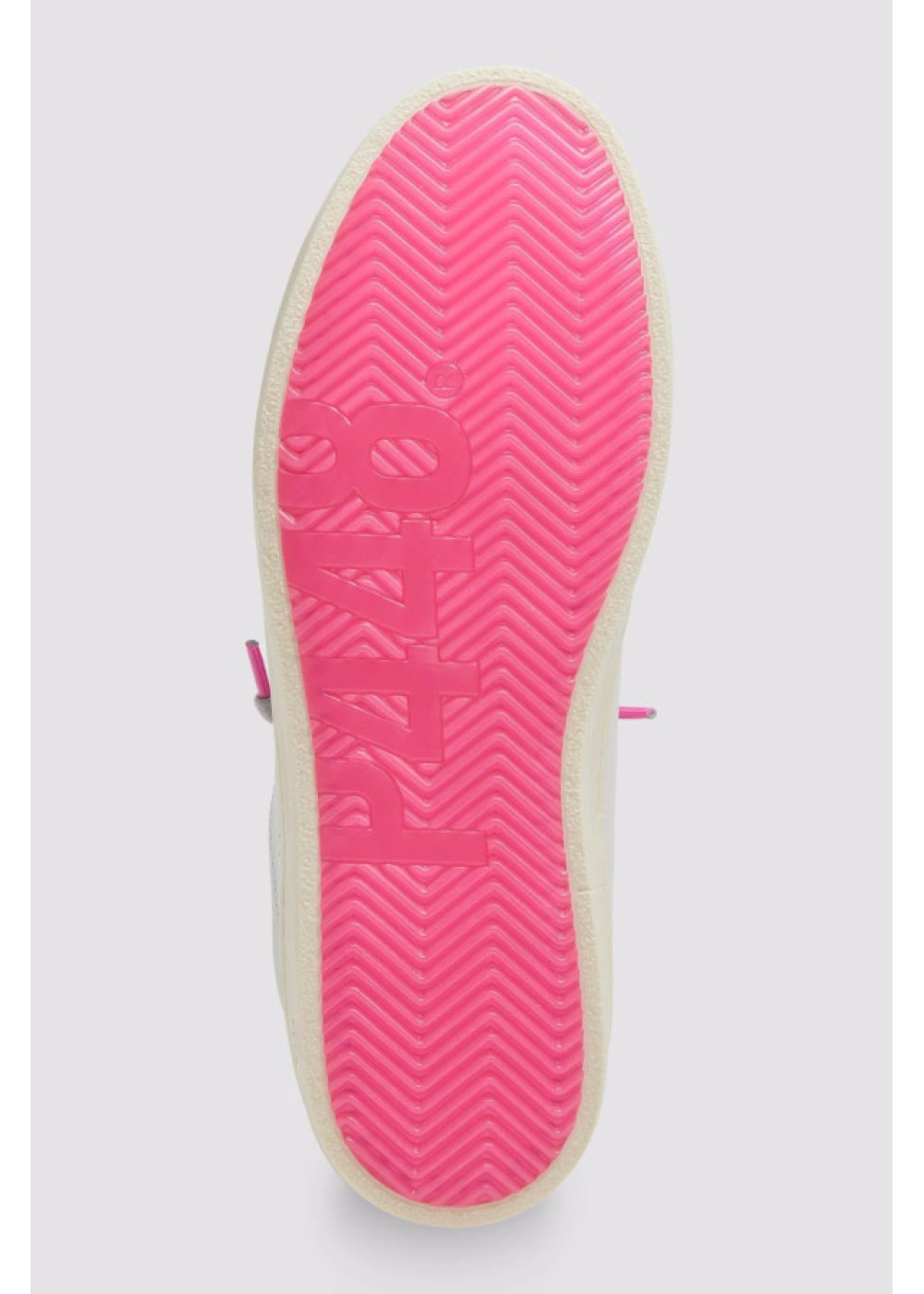 Su base de piel blanca se ve realzada por sutiles detalles en ante claro, mientras que la lengüeta y el talón presentan un impactante ante metalizado en negro y multicolor. El contraste cobra vida con los cordones de algodón gris, acentuados por punteras fucsias, y la distintiva suela de goma P448, que irrumpe con vibrantes bandas de rodadura en rosa fluorescente. Por dentro, el forro de rizo y la plantilla de espuma viscoelástica garantizan una comodidad inigualable para todo el día.